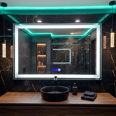 Espejo con repisa y lámpara ideal para usarse en baños.