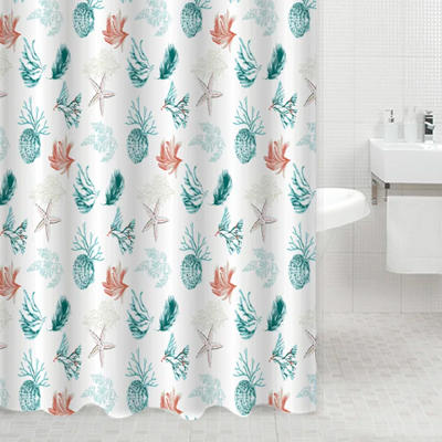Cortina decorativa de la marca American Dream Fresh Home, confeccionada en poliéster Jacquard de alta calidad sin PVC. Su diseño náutico presenta conchas, estrellas de mar y motivos oceánicos en color...