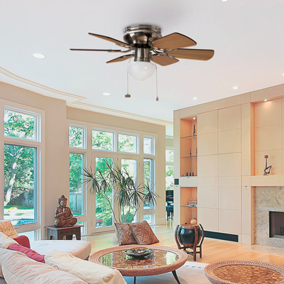 Abanico de 30” equipado con una pantalla blanca opalizada para foco con entrada E26. Su diseño y aspas permiten ventilar áreas interiores de hasta 9 m2, además de utilizarse como un elemento decorativ...