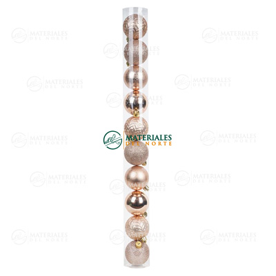 Set de 10 esferas color champagne mate de 6 cm de diámetro. Su acabado y relieve varían según la esfera. Ideales para decoración navideña.