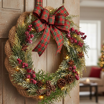 Adorno decorativo de follaje verde con frutos en color rosa diamantado. Es ideal para dar un toque de brillo y alegría a tus arreglos florales y decoraciones navideñas.