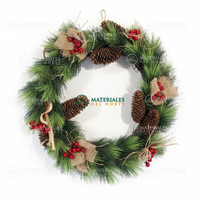 CORONA CON FOLLAJE VERDE Y PIÑAS CON CEREZAS 40cm