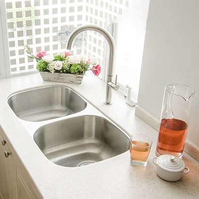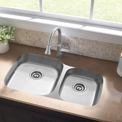 Fregadero de cocina con doble tina fabricada en acero inoxidable 304. Diseñado para instalación de submontar, viene con un recubrimiento de poliuretano que minimiza el ruido y protege contra la conden...
