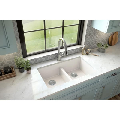 Fregadero de cocina con doble tina, fabricada con minerales de cuarzo en color blanco. Se adapta perfectamente a cualquier encimera, ofreciendo una apariencia moderna y contemporánea. Incluye: tina do...