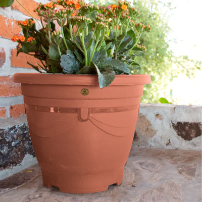 Maceta de diseño artesanal con apariencia de barro, fabricada en plástico resistente. Ideal para decorar interiores y exteriores con un toque tradicional.