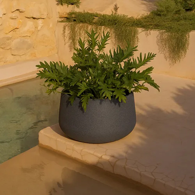 Maceta cilíndrica con amplia base de plantación. Fabricada en polietileno de alta calidad, ideal para plantas medianas o grandes.