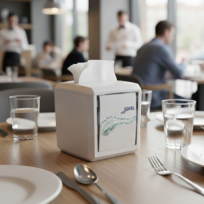 Despachador de servilletas color blanco con capacidad de 250 piezas. Tiene dos visores transparentes fabricados en SAN sobre las zonas frontales, que permiten colocar anuncios de publicidad. Además, u...