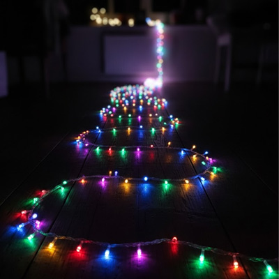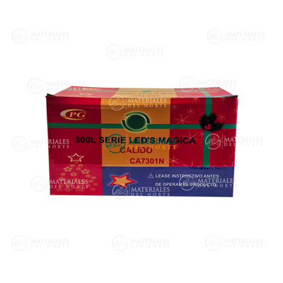 Serie con 300 luces LED multicolor para decoración. Tiene un control el cual le permite controlar la secuencia de iluminación con solo presionar el botón. Ideal para usar en espacios interiores.