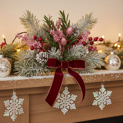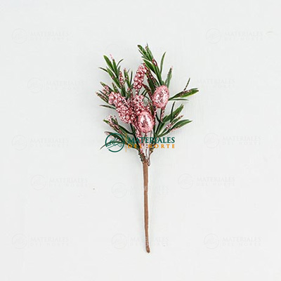 Adorno decorativo de follaje verde con frutos en color rosa diamantado. Es ideal para dar un toque de brillo y alegría a tus arreglos florales y decoraciones navideñas.