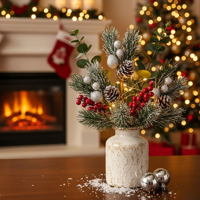 Adorno decorativo de pino con bayas en color champagne diamantado. Es ideal para dar un toque de brillo y alegría a tus arreglos florales y decoraciones navideñas.