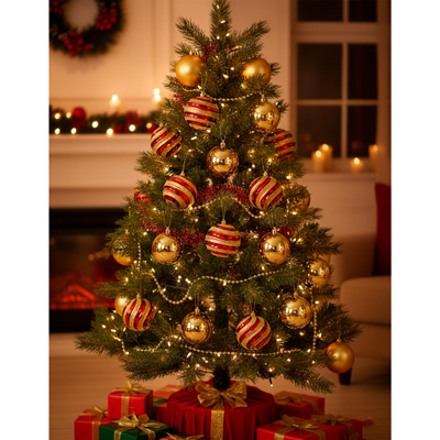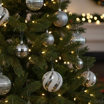 Set de 6 esferas en acabado diamantado con cintilla plateada de 8 cm. Ideal para una decoración navideña abundante, festiva y vibrante.