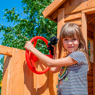Dos anillos de juego coloridos y resistentes, diseñados para colgarse fácilmente en estructuras de juego. Fomentan la diversión y el ejercicio mientras los niños trepan, giran y se balancean.