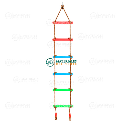 Escalera de cuerda resistente con peldaños de material plástico, ideal para juegos infantiles. Fácil de instalar en estructuras de juego o árboles.