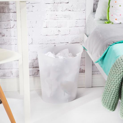 Cesto de basura de 3 galones con una estética moderna y elegante en color blanco translúcido. Su delgado perfil ovalado es ideal para usar en la oficina, el baño, el taller o donde el espacio sea limi...