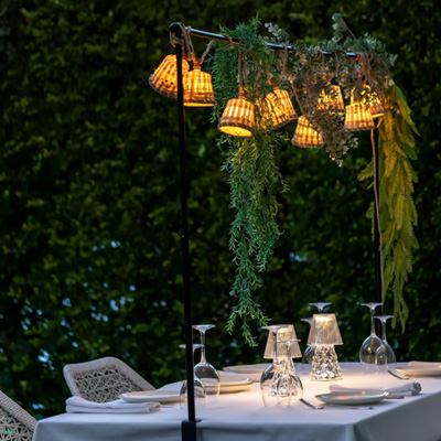 Luminaria de serie LED con pantalla elaborada en fibra natural. Excelente para decorar sobre el exterior del hogar, eventos o fiestas.