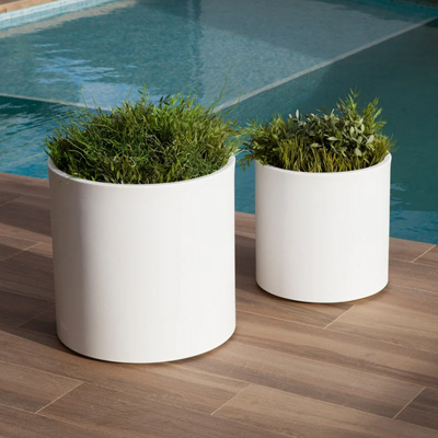 Maceta cilíndrica blanca con diámetro de 30 cm. Incluye soporte lift, ideal para crear diferentes composiciones en ambientes interiores y exteriores.