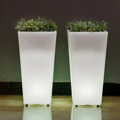 Maceta trapezoidal con lámpara incluida en color blanco frío (6000°K -6500°K) con conexión a cable de 220-240 V. Ideal para crear diferentes composiciones en ambientes interiores y exteriores.