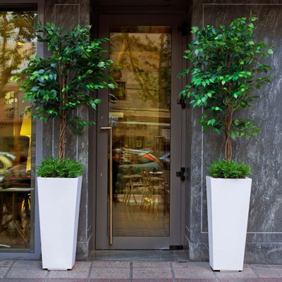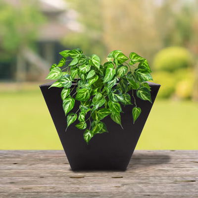 Maceta decorativa con forma trapezoidal, fabricado en polietileno de alta calidad para espacios exteriores como: jardines y patios.