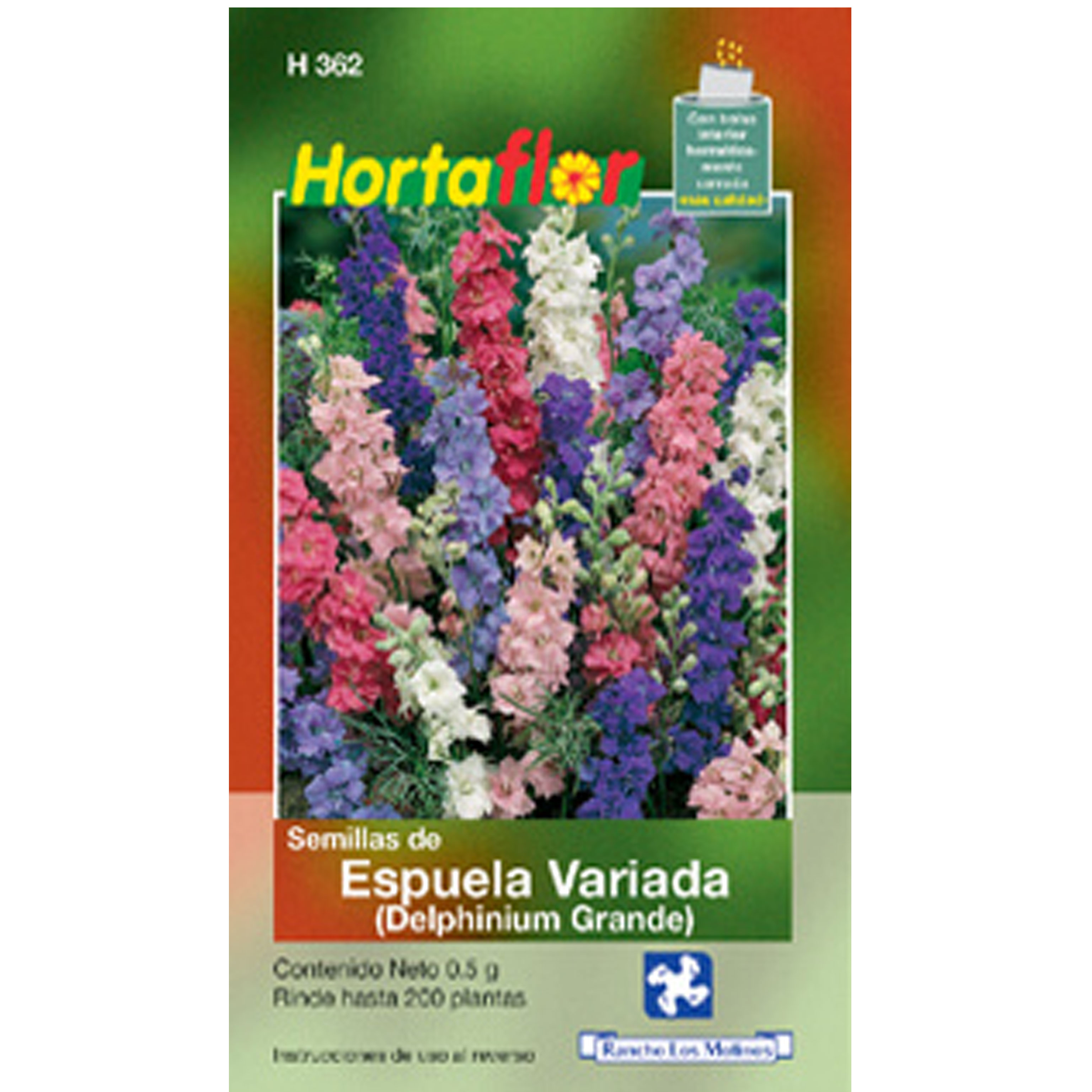 Sobre de semillas de Espuela Variada para sembrar en tu jardín o maceta. El sobre contiene 0.5 g y rinde hasta 200 plantas. Utilización: Macizos altos, ramos, jardines y macetas. Siembra: En macetas o...