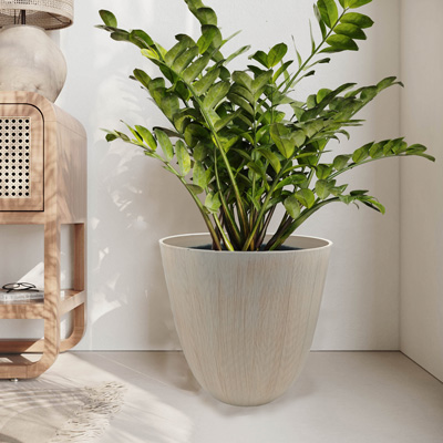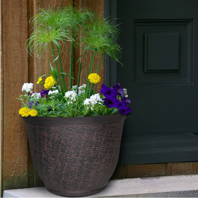 Maceta decorativa de polietileno de 12.5” circular con textura cuarteada. Ideal para plantas medianas y grandes.