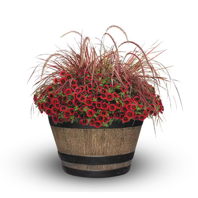 Maceta decorativa tipo barril de 15.5”, fabricada en resina ligera y duradera ofrece un acabado con apariencia a barril. Ideal para plantas y arbustos de tamaño mediano o grande.
