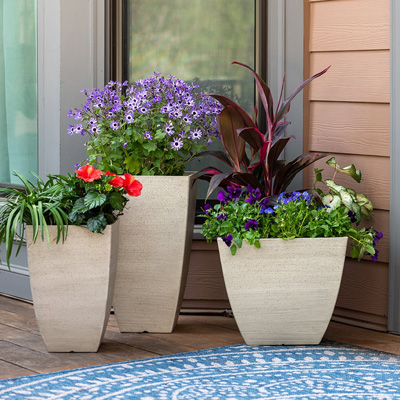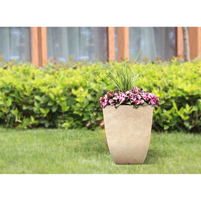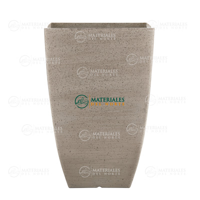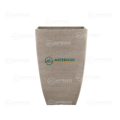 Maceta decorativa en forma cuadrada con apariencia en piedra arenosa. Tiene un amplio volumen de plantación para flores, e incluso para arbustos grandes en espacios exteriores.
