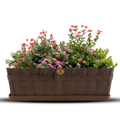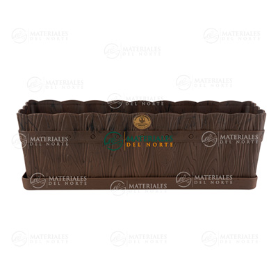 Maceta tipo jardinera con ornamentos en alto relieve en apariencia madera. Fabricada en polietileno de alta densidad para espacio exteriores.