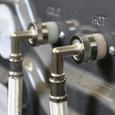 Manguera de 120 cm con codo de 90° ¾” para conectar el agua potable hacia la lavadora.